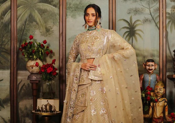 Exquisitely handcrafted and aesthetically designed, this classic lehenga set consists of a skirt, blouse and dupatta. This gold collection boasts of hundreds of handcrafted floral motifs painstakingly embroidered using our signature 3D applique technique.